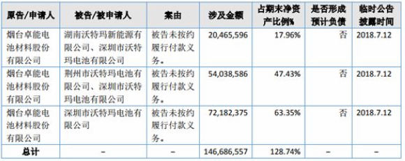 据了解,卓能材料曾向法院提请诉讼,因向坚瑞沃能(300116)部分子公司沃特玛供应磷酸亚铁锂被拖欠货款约1.47亿,至报告披露日,案件尚未开庭审理。