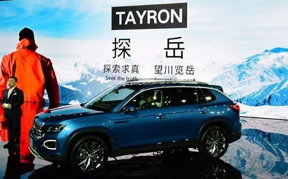 “探岳(TAYRON)的目标是要打造成一个爆款产品。”9月19日,在探岳品牌发布会上,一汽-大众销售有限责任公司总经理董修惠向经济观察网记者表示。当晚,TAYRON宣布其中文名为“探岳”,这是一汽-大众旗下第二款SUV。之前7月上市的探歌是一款A级车SUV,而此次推出的探岳则是一款中型SUV,其直接竞争对手被认为是同属于大众品牌的上汽大众途观L。