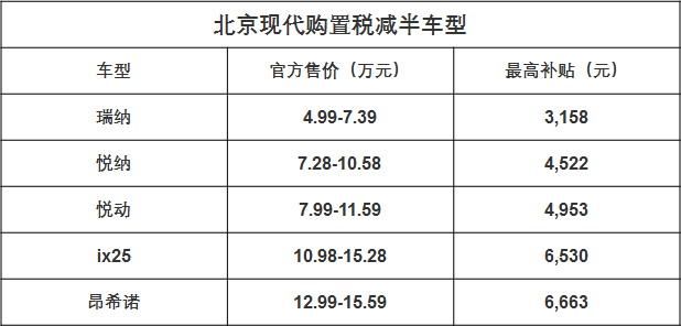 享受厂商50%购置税补贴的为悦动、ix25、悦纳、瑞纳以及昂希诺共5款车型。根据车型售价的不同,这5款车型的最高补贴金额达到6,663元。此外,补贴活动持续到2018年12月31日。