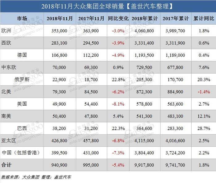 11月份,由于车型向全球统一轻型车辆测试程序(WLTP)转变取得了进展,因此大众集团在欧洲的销量跌幅有所收窄,为3%,共交付353,000辆新车。在德国本土市场,大众集团11月交付量为106,800辆,同比下滑4.9%。中东欧地区的销量表现较好,上个月销量为70,000,实现了0.9%的正增长。其中,该集团在俄罗斯的交付量大涨22.8%至22,900辆。