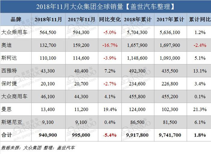 根据官方公布的数据,11月份,大众集团全球交付了940,900辆新车,与去年同期相比下滑5.4%。今年1至11月,大众集团全球交付量实现了1.8%的同比增幅,总量至9,917,800辆。大众集团表示,尽管部分市场环境紧张、陷入停滞状态,但是2018年整体销量非常有可能创下新高。
