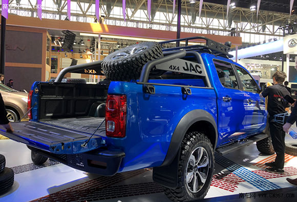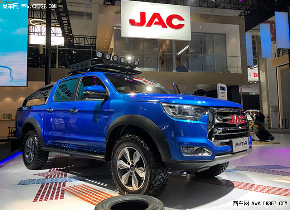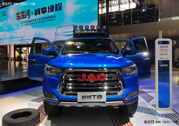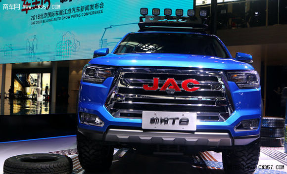 在这个颜值当道的时代,交朋友要看脸,买手机要挑外观,选车当然也要看外型了,在豪车云集的北京车展,要想脱颖而出车子的颜值系数一定不会低,走进帅铃T8的展区,首先就会被一抹亮丽的蓝色所吸引,帅铃T8使用了全新设计的外观造型,中网采用了江淮家族化设计,宽幅镀铬件搭配红色JAC品牌LOGO,极富视觉冲击力。大灯采用了全新的一体式硬派组合灯组,远近光一体透镜大灯,扁平式镀铬灯圈,长条LED日间行车灯,搭配五边形雾灯,整个前脸看起来威猛帅气。