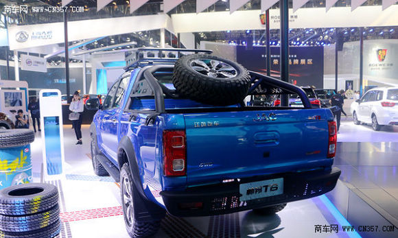 帅铃T8,车身尺寸方面达到5325×1880×1830MM,轴距为3090MM,驾乘空间宽敞。高大的车身结构,搭配黑色哑光材质的粗狂防滚架以及极具个性的车顶行李架,在货箱部位配备全尺寸轮胎,让其更赋越野性,整车美式皮卡味十足。