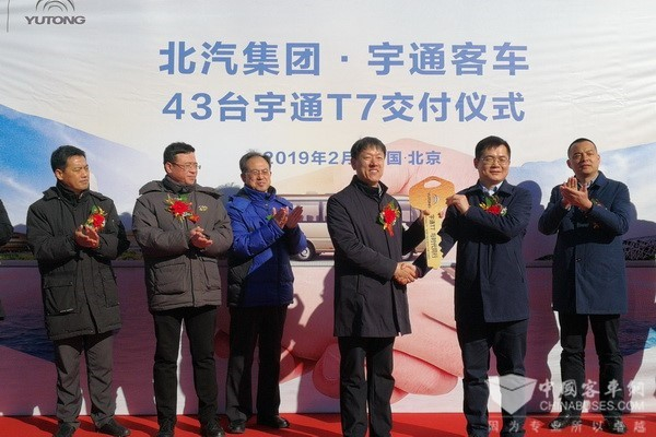2018年2月15日,在大雪后艳阳高照的北京,43辆宇通高端商务客车T7交付北京北汽出租汽车集团有限责任公司(以下简称“北汽集团”),北汽集团董事长张峻峰、北汽集团副总经理张国栋、宇通客车国内营销副总监王文韬等领导和嘉宾出席了交付仪式。据介绍,此批交付的宇通T7将服务2019年的全国两会。