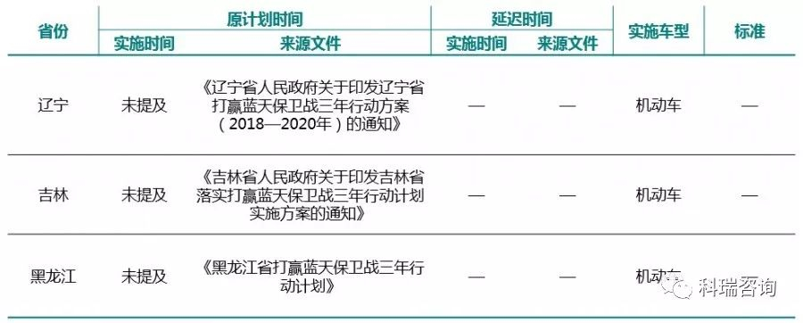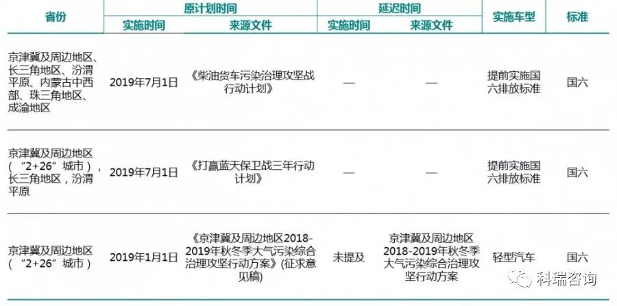 据科瑞咨询统计,之前各地区发布的文件多为征求意见稿,且将国六实施提前至2019年初,延迟后,大部分地区实施国六标准的时间节点集中在2019年7月1日,与“蓝天保卫战”计划吻合,而其他未提出国六提前实施的省份,提出的多为“推广使用符合国六标准的燃气车”,如无变化,这些省份将按国家发布的时间实施。