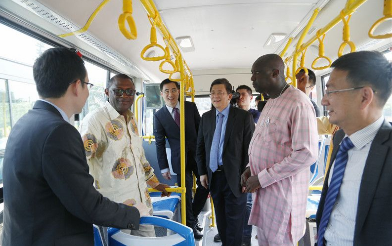 参加仪式的领导参观即将发运塞拉利昂的金旅客车