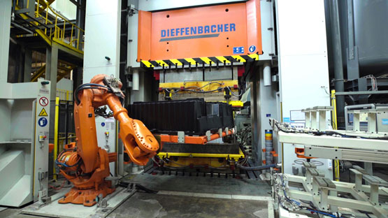 为生产专利配方的SMC片材,赛史品威奥使用全自动生产线,精确控制高强度树脂和玻璃纤维等不同原材料的配比。生产出的SMC片材自动裁切后送入模具中,经由全球领先的4300吨压机进行真空模压冷却成型。这种先进的制造工艺可以充分满足主机厂对零部件作业的高效率、高质量要求。