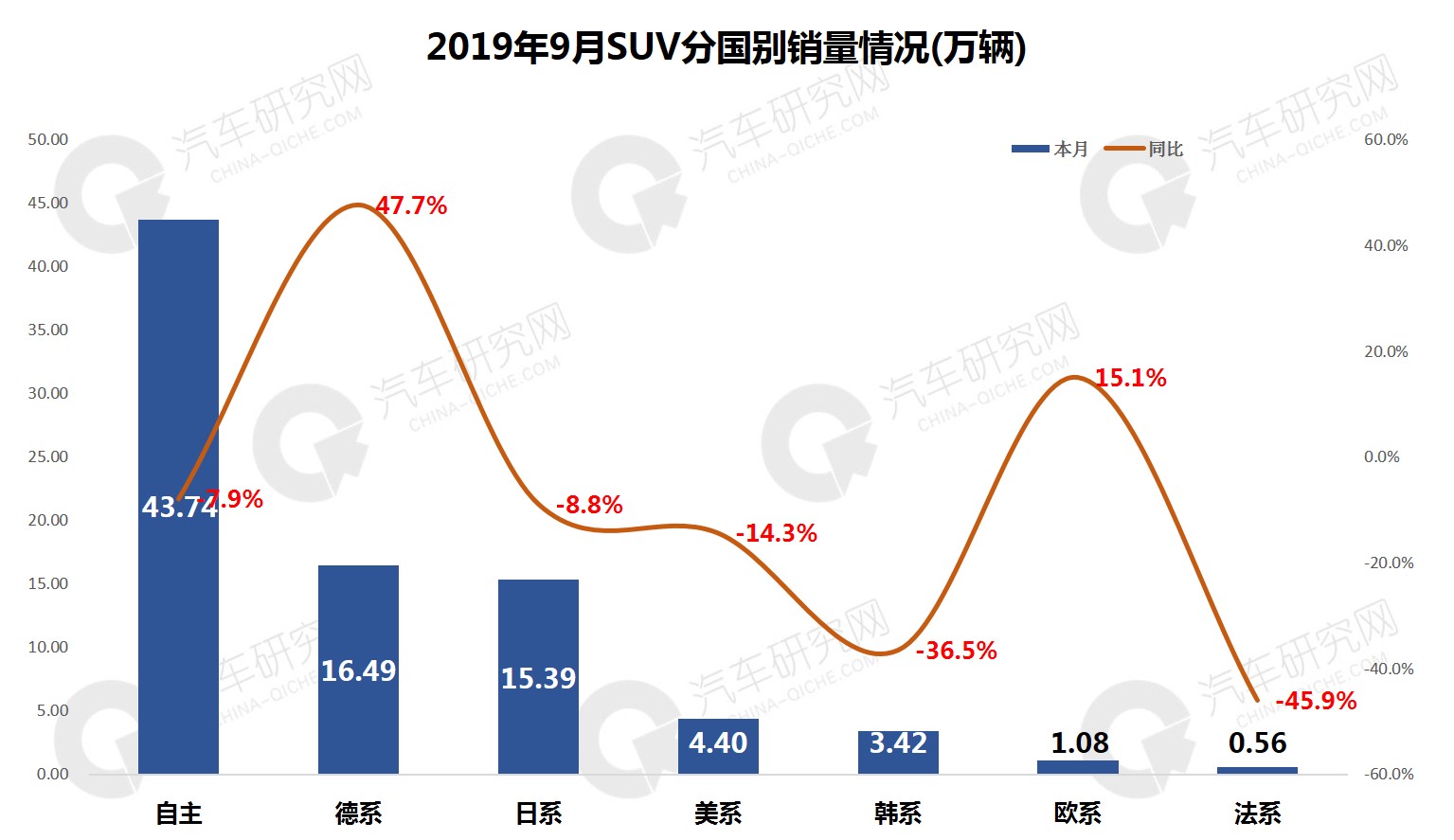 从国别来看,本月SUV市场自主品牌以43.74万辆遥遥领先,德系车增长幅度较大,增幅达47.7%;法系车降幅最大,同比下降45.9%;