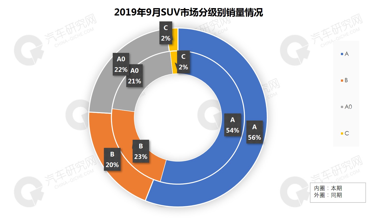 从级别来看,A级SUV仍占据一半的市场,份额达下降至56%;B级车型次之份额下降至20%;A0级SUV市场份额增长至22%,C级市场份额保持不变。