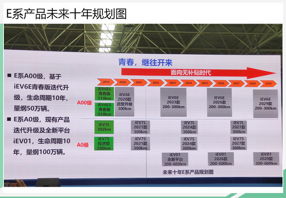 目前,iEV6E青春版(iEV6EL青春版)已经上市,按照规划,在年内企业还将基于现款运动版打造iEV6S青春版车型。而在2020年,江淮新能源将推出iEV6E的2020款产品,并对外观造型进行调整;后续iEV6E还将推出2023款、2026款和2029款,周期10年并计划产量50万辆。续航里程方面,可达200-300公里。