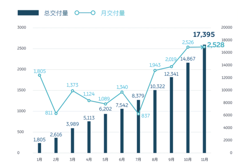就新车交付量来说,今年第三季度,蔚来汽车交付4799辆,当中ES6贡献了较大份额。而据蔚来12月5日公布的最新数据显示,11月,蔚来汽车交付量达2528台,创2019年单月销量新高,并实现连续四个月销量环比上涨。今年前11个月,蔚来汽车累计交付已达17395台。