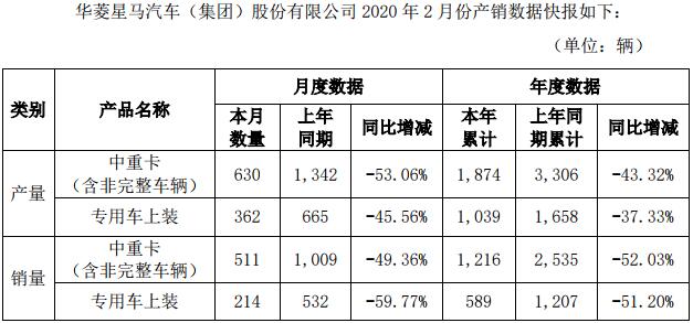 2020年1-2月份,华菱星马累计销售中重卡(含非完整车辆)1216辆,同比下降52.03%;销售专用车上装产品589辆,同比下降51.2%。
