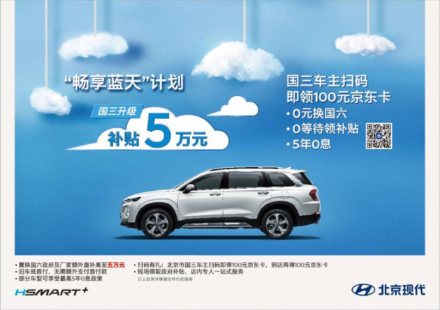 “畅享蓝天”换购计划包含北京现代旗下全系车型(燃油车、新能源车)。国三车主使用现有旧车置换北京现代新车,在享受政府提供的补贴基础上还可以获得北京现代提供的优惠政策,累计优惠最高可达5万元。在置换时,北京现代将提供专人服务。