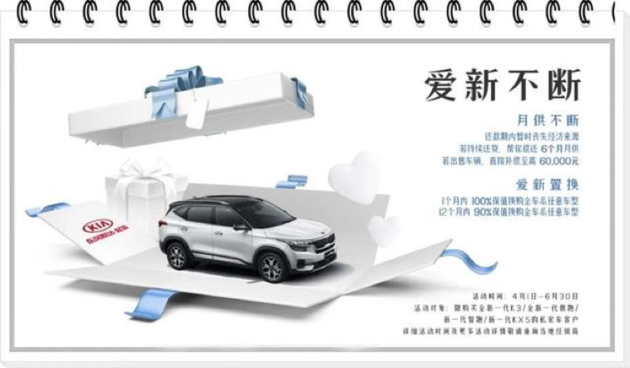 东风悦达起亚推出了“爱新不断”相关项目。“爱新换置”指客户在活动期间购买指定车型,购车后一个月内想要置换其他车型(东风悦达起亚全车系任意车型),旧车可享受按开票价原价回购的服务。如果在购车12个月内,可享受旧车按9折开票价回购。