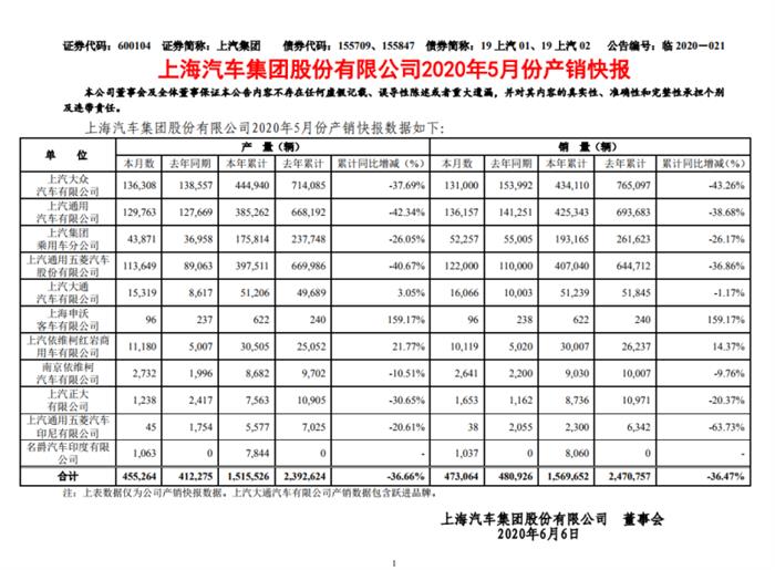 6月5日讯 今日,上汽集团(SH600104)发布了5月产销快报,其中产量45.53万辆,同比增长10.43%,销量47.31万辆,环比增长13.3%,同比下降1.63%。