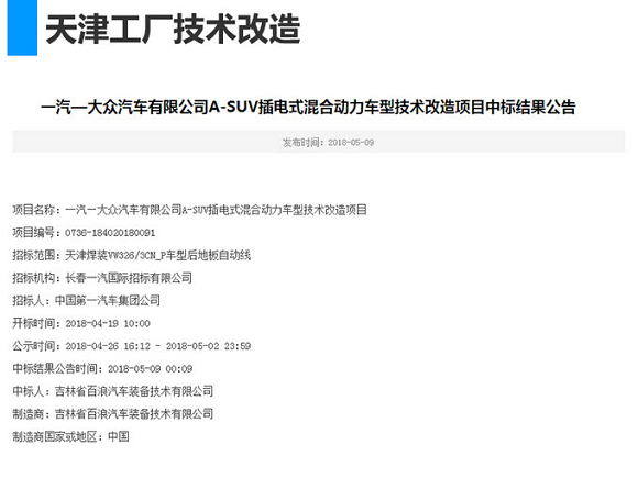 资料显示,一汽-大众天津工厂已于2017年完成设备、工装主体安装工作,目前已进入预批量生产阶段,预计将于今年下半年建成投产。