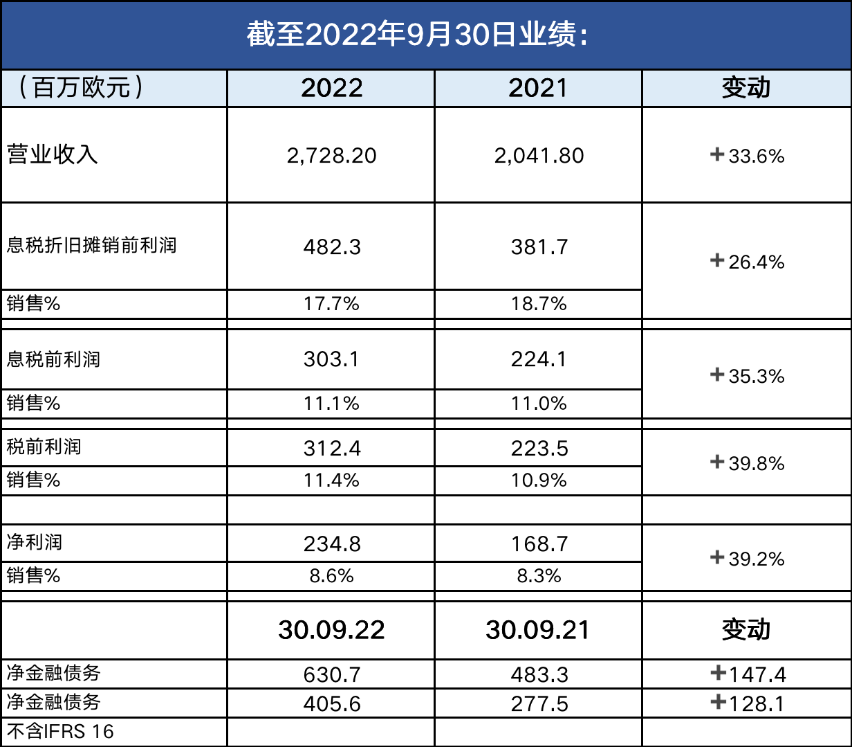 2022年前9月的收入大幅增长至27.282亿欧元,比2021年同期增长33.6%;息税折旧摊销前利润增长26.4%;净利润增长39.2%