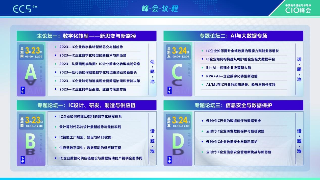 ECS 2023第四届中国电子通信与半导体CIO峰会同期将举行精品展台、CIO面对面、硬核座谈会、“ECS2023”欢迎晚宴等活动。