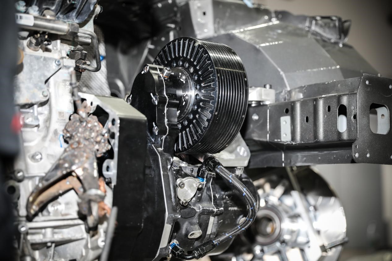 结构上,奕炫MAX的电控单元、电池以及冷却装置均布局在原车副驾驶处,电机布置在变速箱壳体上,专门设计电机与变速箱之间的过桥,实现将电机动力传递到输出半轴上;由于电机的低扭高的特性,弥补发动机低转速扭矩较小的劣势,大幅优化赛车出弯加速能力,也使车辆的油门响应更加灵敏。