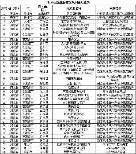 7月28日,2018-2019年蓝天保卫战重点区域强化督查工作继续开展,200个督查组按照工作方案要求,对京津冀及周边地区206个县(市、区)进行督查,发现涉气环境问题136个(见附件)如下: