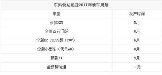 日前,有相关媒体报道,东风悦达起亚的2017年新车计划:2017年将陆续推出起亚K2五门版/CROSS版、全新福瑞迪、改款K4、改款KX5以及全新小型车。