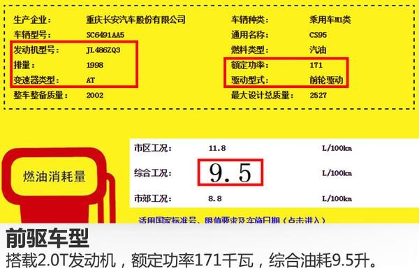从国家工信部公布的信息可知,长安CS95将搭载型号为JL486ZQ3的2.0升涡轮增压发动机,额定功率为171千瓦,与其匹配的是自动变速箱,百公里综合油耗为:前驱车型9.5升;适时四驱车型10.3升。
