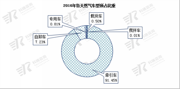 天然气自卸车的销量为2500辆,同比增长188%,比重下降至4.06%;天然气专用车底盘销量为450辆,同比增长637%,增速很快,比重小幅增长至0.72%;天然气载货车销量为230辆,同比增长132%,比重下降至0.37%;天然气搅拌车在2017年销量达到150辆,也呈现了快速增长的趋势,但总量依然很小。