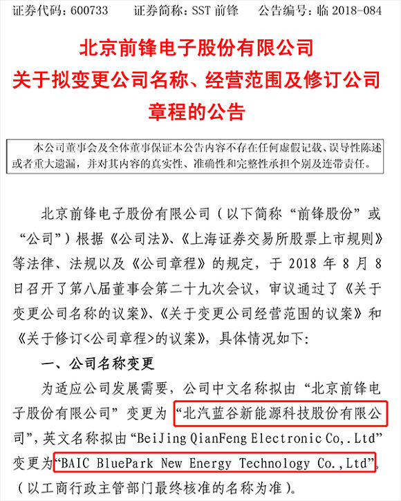 2018年8月8日晚间,前锋股份公告称,公司中文名称拟由“北京前锋电子股份有限公司”变更为“北汽蓝谷新能源科技股份有限公司”。