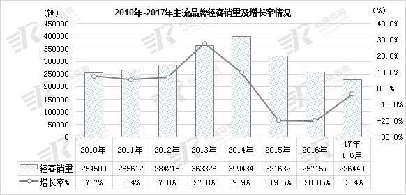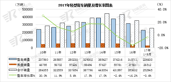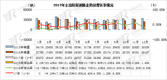 2017年1-9月份,全国19家主流轻型客车生产制造厂家共计销售轻客(含量各类底盘)226440辆、累计同比负增长-3.36%,市场销量呈现出持续下滑中,但已有止跌回暖迹象,从负二位数增长率扭转为一位数增长,若按此惯性全年有望实现一位数正增长率。