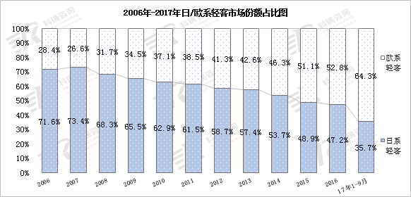 2017年前三季度,欧系轻客的市场份额占比已经达到近65%,而在2006年其市场份额占比仅为28%,市场份额比重翻番了一倍多。与此同时,日系海狮轻客自2006年的市场份额占比七成多,下跌至今年不到四成,由此可见适销对路的欧系轻客由已经全面碾压日系轻客,尤其是在客货兼容市场上占据市场主导地位,并还有不断向城市物流快运市场扩张扩大之趋势。