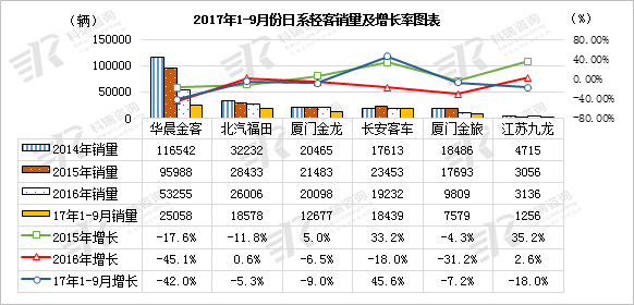 2017年1-9月,主要日系海狮轻客(含准日系轻客)六大生产车企,除北汽福田风景海狮轻客和长安准日系轻客为正增长率外,其他品牌市场销量全部呈巨跌、大滑和小降的发展态势中。其中以华晨金杯跌幅竟达40多个百分点为其标志着日系轻客从此没落而难以“咸鱼翻身”,这与453号政策与大型微型客车的负作用和冲击有直接的关联性。未来日系轻客产品及营销政策如何转变,是摆在众车企面前的严峻问题。