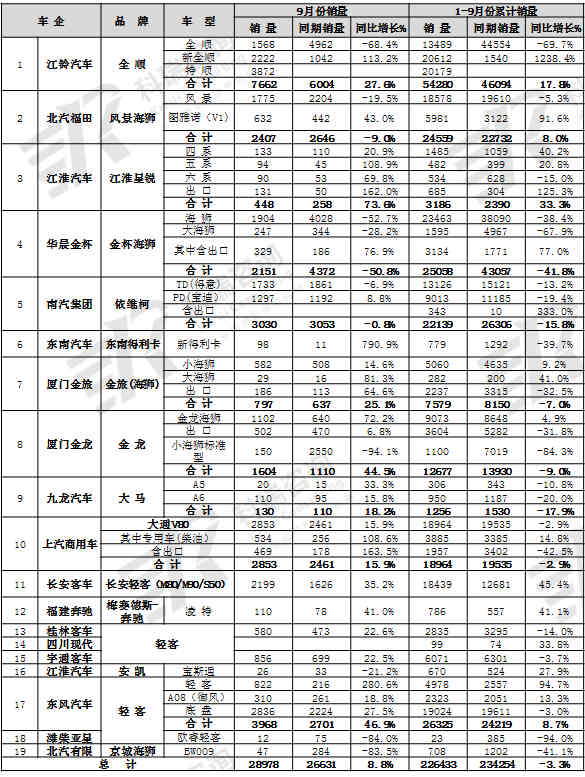 2017年1-9月份轻型客车分品牌销量及增长率情况表