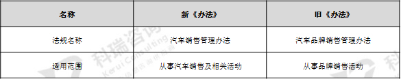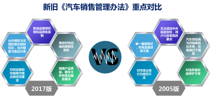 《汽车销售管理办法》(商务部令2017年第1号文,下称“新《办法》”)于2017年4月正式颁布,自7月1日起实施;《汽车品牌销售管理实施办法》(下称“旧《办法》”)同时废止。新《办法》包括总则、销售行为规范、销售市场秩序、监督管理、法律责任、附则等6章共计37条,核心在于规范市场中参与各方的权责及约束。
