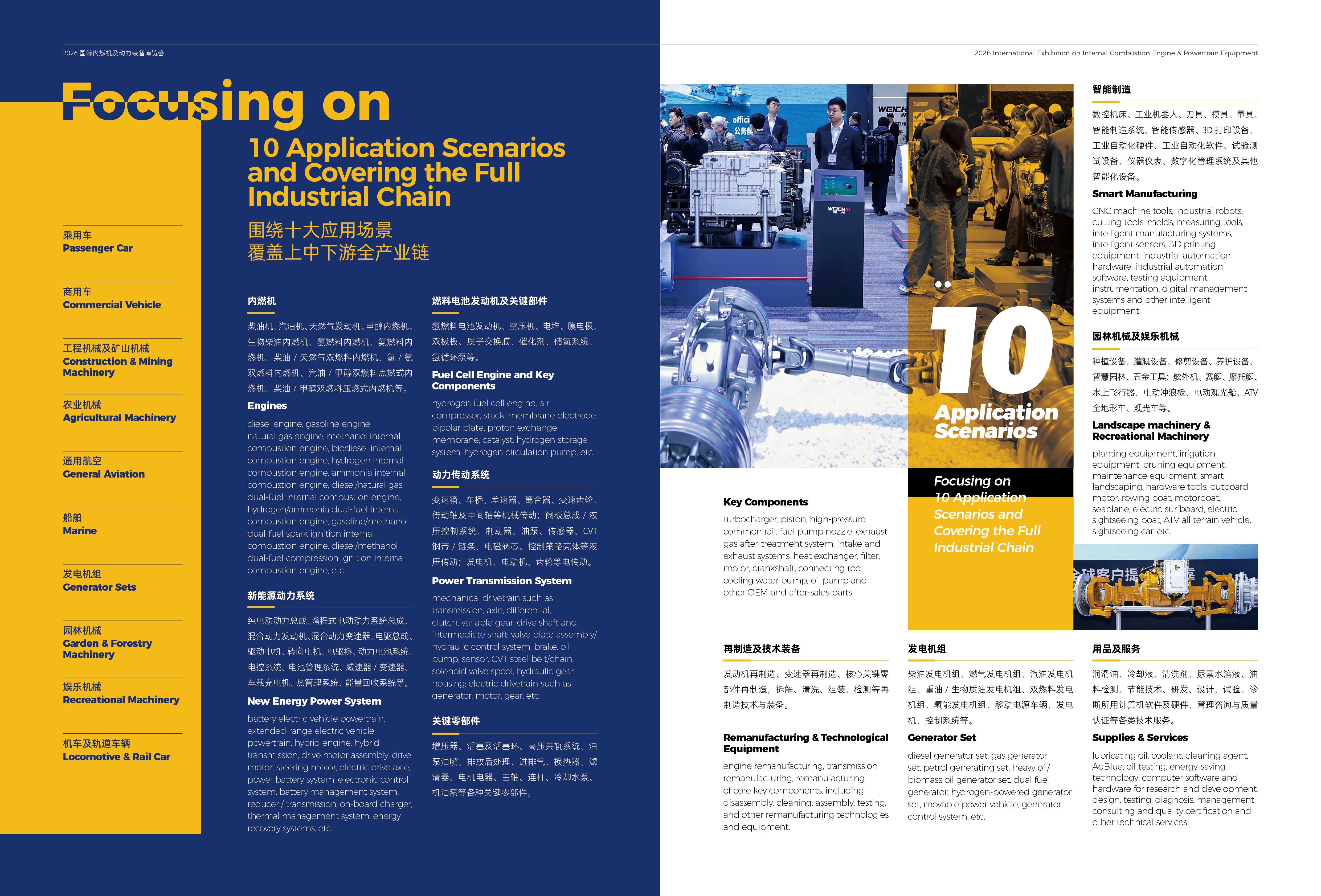 深度覆盖乘用车、商用车、工程机械及矿山机械、农业机械、船舶、发电机组、通用航空、园林机械、娱乐机械、机车及轨道车辆等10大核心应用场景。无论您关注动力优化、替代燃料,还是电驱动、燃料电池技术,亦或是传动系统、智能制造装备,这里都是您展示成果、对接需求、拓展商机的一站式核心平台。