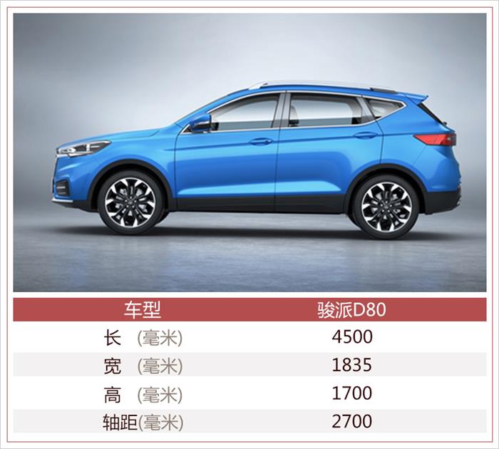 外观配置方面,骏派D80全系标配前大灯光线水平调节、电动调节外后视镜、外后视镜转向灯、车顶行李架和铝合金轮毂等。高配版车型还配备了全景天窗、晶钻式LED大灯、外后视镜电动折叠+锁车自动折叠等。