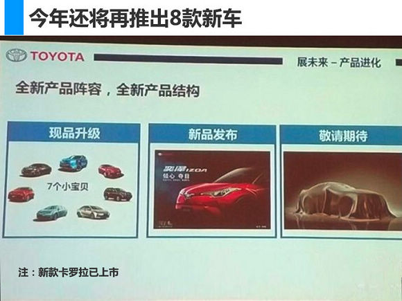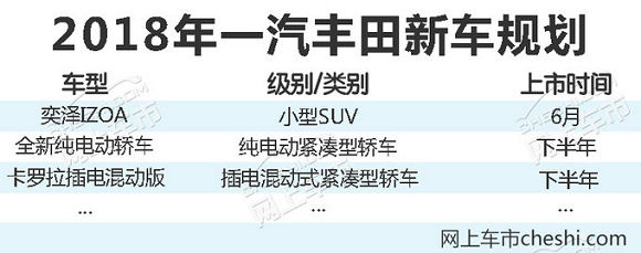 2018年是一汽丰田新三年发展期的第一年,也是企业转型的关键之年,将引入基于TNGA架构打造的首款全新小型SUV,此外还会推出多款全新/改款车型,以此来不断壮大旗下产品阵容。今年3月,新款卡罗拉已经上市,但这只是一汽丰田为消费者带来的一道“开胃菜”。2018年4月24日,一汽丰田奕泽IZOA首发亮相,正式开启了品牌全新一轮的产品攻势。根据一汽丰田此前公布的产品计划来看,今年剩余时间内还将推出8款新车,来冲击71.5万辆的年销量目标。