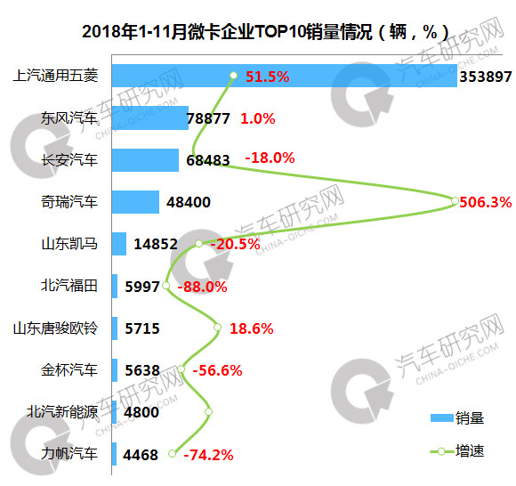1-11月,微卡企业中,上汽通用五菱位居第一,销量达到353897辆,同比增长51.5%,东风汽车位居第二,销量为78877辆,同比增长1.0%;前十企业中,奇瑞汽车增幅最大,同比增长506.3%。