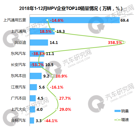 2018年MPV企业中,上汽通用五菱位居第一,累计销量接近70万辆,同降幅接近-15%,上汽通用全年销售19.3万辆,同比增长接近20%;前十企业中比亚迪增幅最大,增速300%,销量达到14.1万辆。