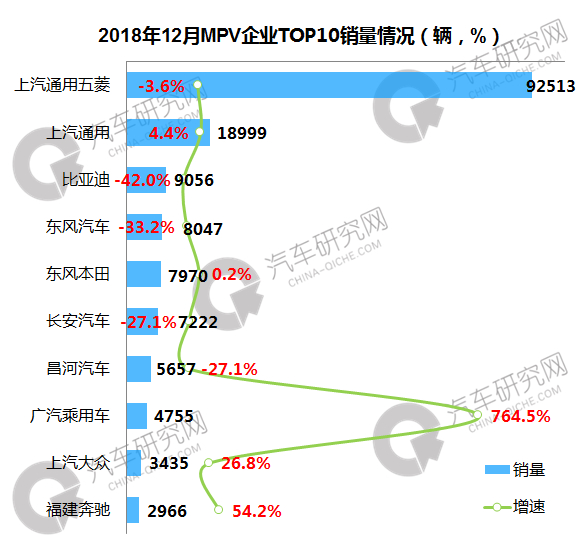 12月MPV企业中,上汽通用五菱遥遥领先,销量突破9万辆,同比下降3.6%;上汽通用位居第二,同比微增4.4%,销量达到1.9万辆;前十企业中,广汽乘用车增速最大,增幅超过700%,位列第八。