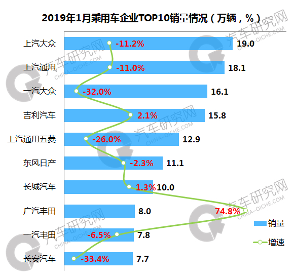 1月乘用车企业中,上汽大众位居第一,销量达到19万辆,同比下降11.2%,上汽通用紧随其后,销量达18.1万辆,同比下滑11.0%;一汽大众本月下滑32%,位居第三,前十企业中吉利、长城、广汽丰田实现增长,其余企业均大幅下滑,广汽丰田表现突出,增幅近75%。