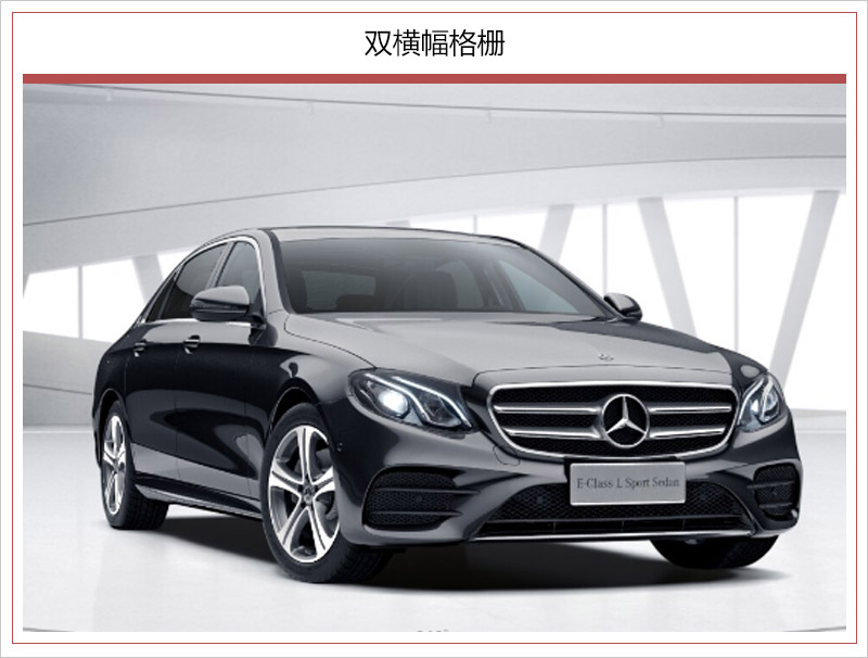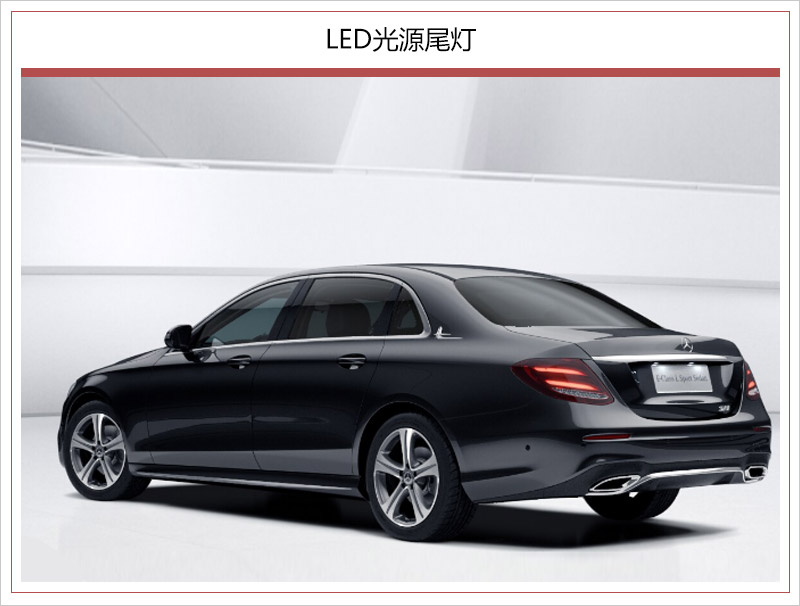 新车前脸采用双横幅镀铬进气格栅,两侧熏黑式大灯组配以LED日间行车灯,整体辨识度极高;下格栅采用贯通式设计,同时底部带有银色护板。尾部造型圆润,两侧尾灯采用LED光源,点亮效果十分醒目;后保险杠造型简洁,底部双边共两出尾排带有镀铬装饰点缀,更显运动。此外,新款E级全新轮圈采用五辐式设计,颇为动感。