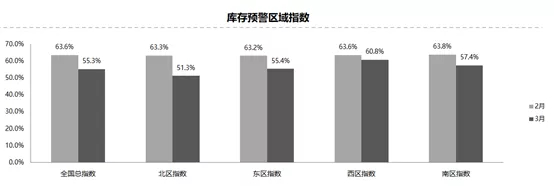 从区域指数情况看: 3月份全国总指数为55.3%,北区指数为51.3%,东区指数为55.4%,南区指数为57.4%,西区指数为60.8%。