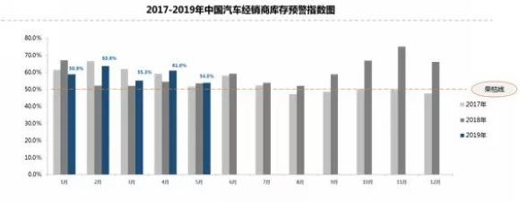 2019年5月31日,中国汽车流通协会发布的最新一期“中国汽车经销商库存预警指数调查”VIA(Vehicle Inventory Alert Index)显示,2019年5月汽车经销商库存预警指数为54.0%,环比下降7.0个百分点,同比上升0.3个百分点,库存预警指数位于警戒线之上。