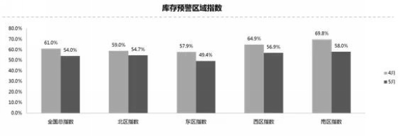 从区域指数情况看:5月份全国总指数为54.0%,北区指数为54.7%,东区指数为49.4%,南区指数为58.0%,西区指数为56.9%。五一小长假及车展刺激市场,各区较4月库存预警指数有所下降,东区库存预警指数位于警戒线以下。