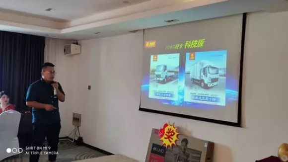 由片区经理赵群猛讲解了中国重汽集团发展历程和豪沃轻卡成长道路,以科技版车型差异化优势为主导,着重讲解了科技版车型7大升级以及升级优势,充分论证了车型升级换代减少自重但不减承重的产品品质,并且科技版车型自重合规、上户无忧、油耗低、残值高等优势。