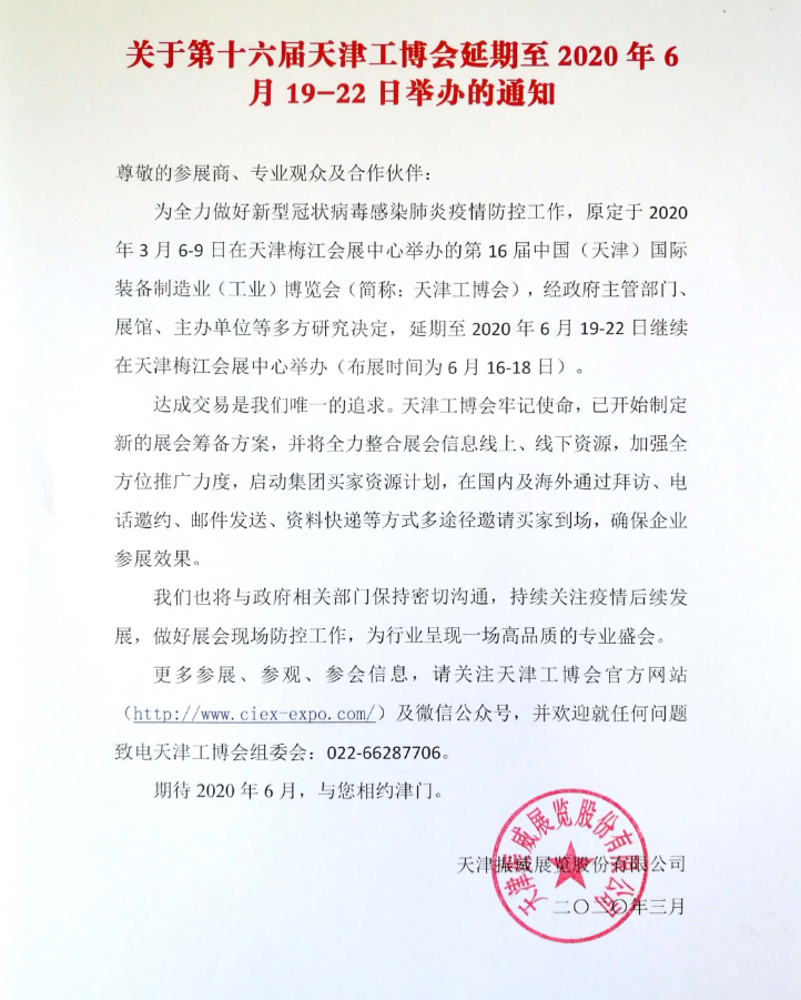 受当前疫情影响,原定于2020年3月6-9日举办的第16届天津工博会其重要子展汽车装备展,将定于2020年6月19-22日原地点天津梅江会展中心隆重举办。