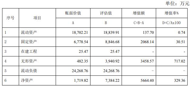1、经资产基础法评估,纳入评估范围内的资产组评估价值为7,384.22万元(不含增值税),较账面净资产1,719.82万元,增值5,664.40万元,增值率329.36%。具体评估情况为: