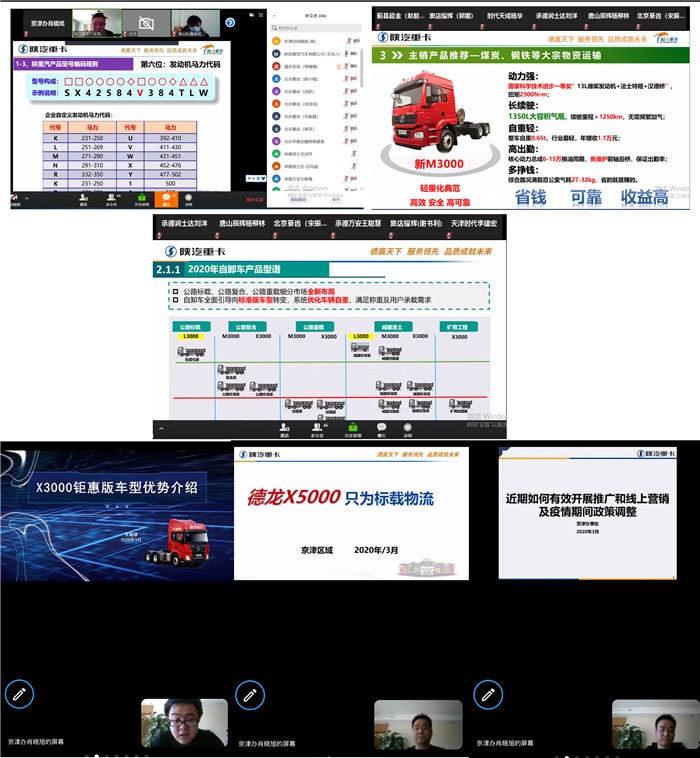 面对疫情过后市场面临的机遇与挑战,销售公司各办事处通过实施陕汽商学院远程培训、抖音线上直播室推广和各类视频会议交流会等线上服务支持,全面统一目标与营销思路,为客户提供最优质的服务。陕汽京津办事处紧跟步伐,于3月15日在区域内通过网络授课方式,从综合业务、国六天然气、自卸车、X3000、X5000、市场推广、数字营销等各方面对渠道业务人员进行综合培训。