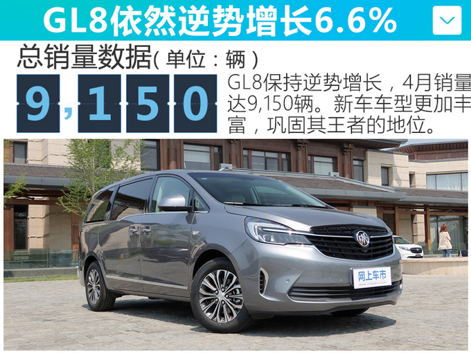 4月份,别克品牌销量达6.48万辆,实现了同比、环比双增长,增幅分别为29.5%、44%,中高端车型全部实现了同比正增长,销售结构进一步优化,实现了销售“质”、“量”双提升。在具体车型方面,MPV车型GL8依然逆势增长,4月销量为9,150辆,同比增长6.6%,4月份别克还推出了全新GL8 Avenir版本,再此前7座版的基础上增加了更豪华的6座与4座版车型。新车上市后反响热烈,4座旗舰车型预定占比将近一半,4座和6座车型订单占比高达9成,另外5月4日新款GL8也将上市,进一步巩固别克在MPV市场王者的地位。
