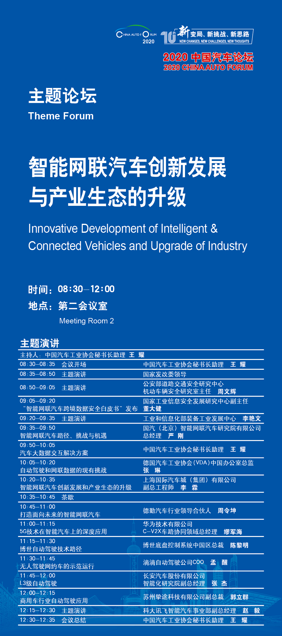 中国汽车工业协会秘书长助理王耀将担任嘉宾主持,国家发改委领导、公安部道路交通安全研究中心机动车辆安全研究室主任周文辉、工业和信息化部装备工业发展中心李艳文将分别做主题演讲,国家工业信息安全发展研究中心副主任董大健将发布“智能网联汽车数据跨境监管白皮书”。